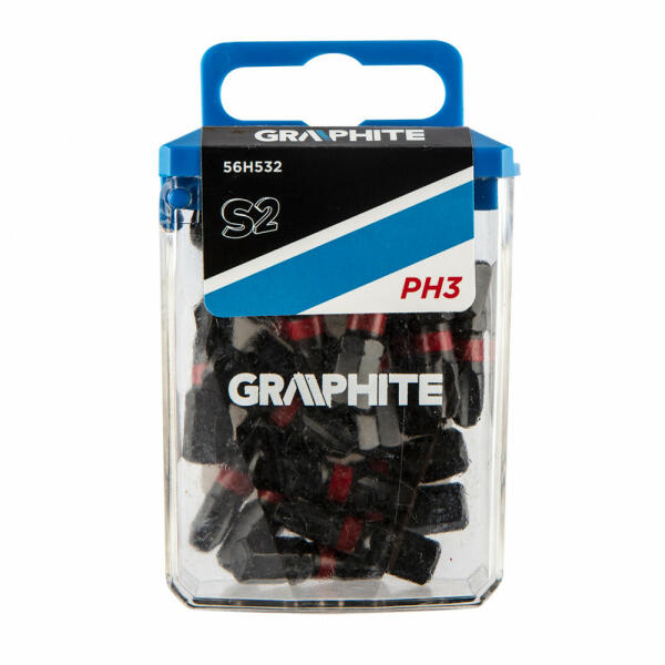 Graphite torziós bit ütvecsavarozáshoz (ref. 56H532) PH3x25 mm. Nagy teljesítményű bitek, amelyeket nagy nyomatékú csavarbehajtóval vagy ütvecsavarozóval, történő munkavégzéshez terveztek. Kiváló minőségű S2 acélból készül, amelyet fokozott rugalmasság és a mechanikai sérülésekkel szembeni ellenállás jellemzi. A nagy nyomaték hatására forgó torziós zóna csökk