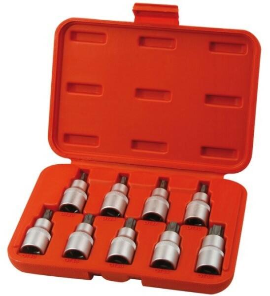 bitdugófej klt. , 9db, lyukas torx befogás: 1/2", hossz: 55mm méretek: 20-25-27-30-40-45-50-55-60 anyag minőség: Bit: S2, dugófej foglalat: C. V. műanyag dobozban