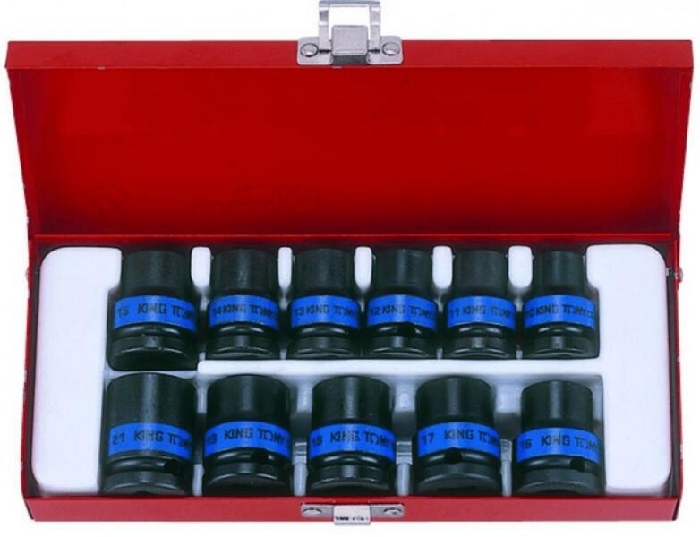 Minőségi King Tony márkájú 24 részes 1/2 collos dugókulcskészlet King Tony 1/2˝ kézi dugókulcs készlet jellemzői 4335: 8, 9, 10, 11, 12, 13, 14, 15, 16, 17, 18, 19, 21, 22, 24, 27, 30, 32mm 4572-12 T-hajtó kar: 300mm 10"-os nyomógombos racsni Univerzális csatlakozó Toldószárak: 125, 250mm Műanyag hordtáskában Tömeg: 4,14 kg King Tony dugókulcsfej jellemzői 6 szögű belső