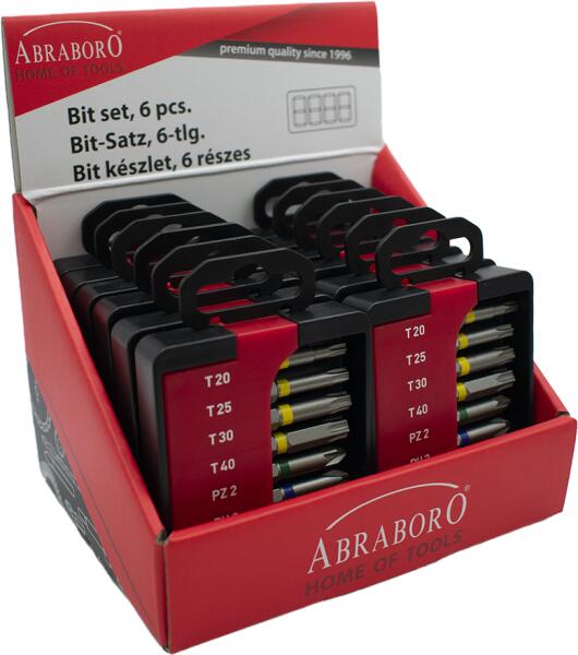 Kiszerelés: 12 darab 6 részes bitkészlet kínálóban A 6 részes bitkészlet tartalma: 1 x PH2 x 50 mm 1 x PZ2 x 50 mm 1 x Torx 20 | Torx 25 | Torx 30 | Torx 40 x 50 mm