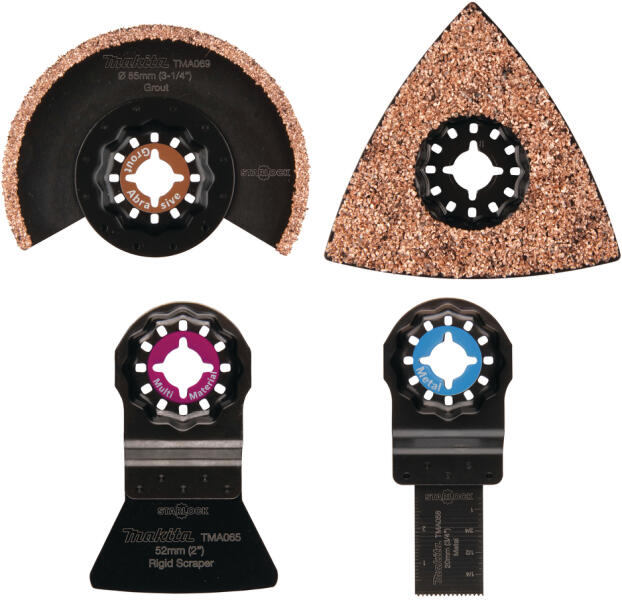 Starlock 4 részes csempekészlet többfunkciós szerszámokhoz. A készlet TMA058, TMA065, TMA069 és TMA073 elemekből áll. TMA058 Merülő fűrészlap 20x30mm acél B-64923 Ideális: vékonyfalú alumínium profilokhoz, színesfém profilokhoz, acéllemezekhez 1 mm-ig, edzetlen szögekhez és csavarokhoz. Alkalmas: puha fa, keményfa, rétegelt lemez, forgácslap, parketta, laminált, bútorla