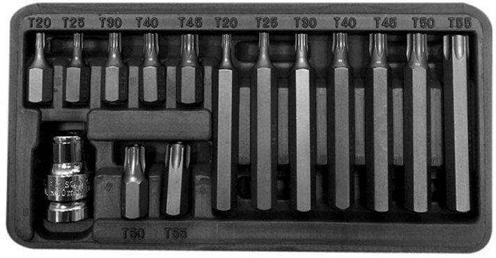 Készlet tartalma: - adapter 1/2", 10 mm - lyukas TORX bitfejek: T20, T25, T30, T40, T45, T50, T55, L= 30 mm és L= 75 mm