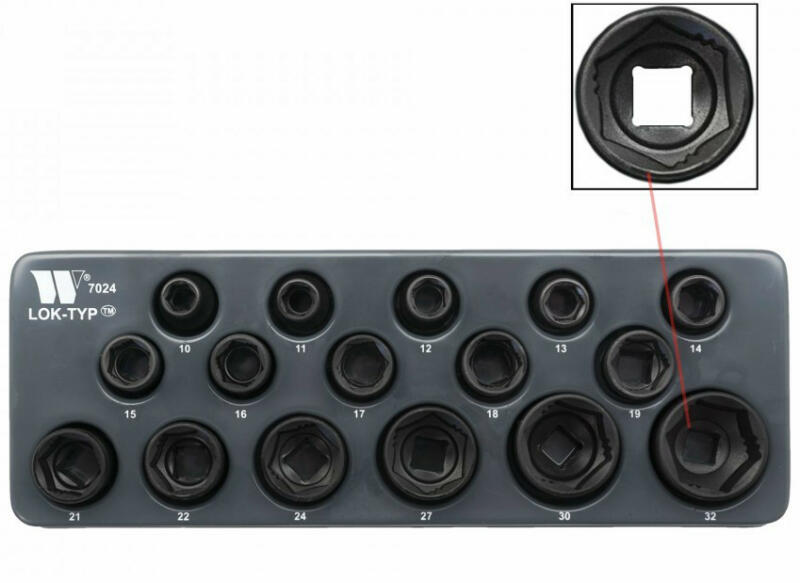 Speciális, Lok-Typ, 16 részes légkulcsfej készlet. Normál kialakítású. Lok-Typ típus, a legfeljebb 85%-ban elhasználódott "elnyalt" csavarok eltávolíthatók ezzel a rendszerrel. Előnye, hogy a szabványos hatlapú csavaroknál is használhatjuk, de kialakításuknak köszönhetően (3 lapján 2 - 2 bevágás található) az elhasználódott csavaroknál is használható. Előszeretet