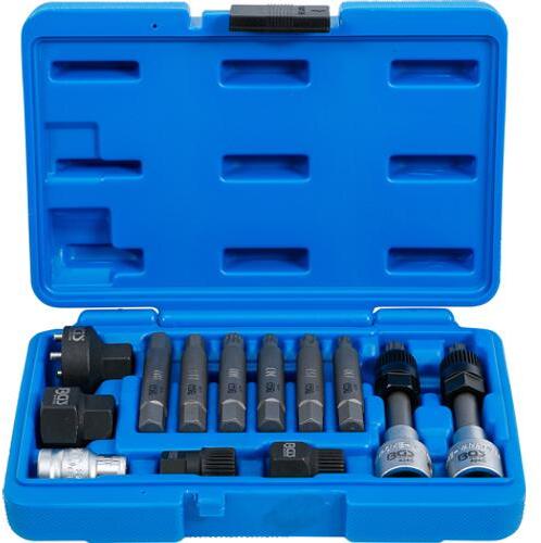 különleges bit készlet váltóáramú generátorhoz megfelelő szerszámokkal az ékszíjtárcsa összeszereléséhez megtartani a tárcsát 33 fogú bittel belső hatszögű dugókulcs (hatszögű meghajtással): 8 és 10mm belső spline bit (hatszögű meghajtással): M8 + M10 T profilú bit (hatszögű meghajtással): T40 és T50 2 összeszerelt és használatra kész bit T50 és M10 sohasem