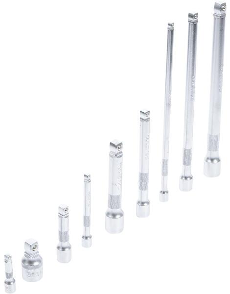 Anyag: Króm- vanádium acél A szárak vége kerekített a dugókulcs fejek dönthetőségéért. Bruttó súly: 1460 g Készlet tartalma 3 billenős hosszabbító, 6,3 mm (1/4"): 50 - 100 - 250 mm 3 billenős hosszabbító, 10 mm (3/8"): 75 - 150 - 250 mm 3 billenős hosszabbító, 12,5 mm (1/2"): 50 - 125 - 250 mm