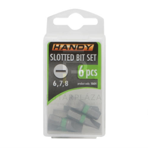 Handy 6 db-os bitfej szett - egyenes 6,7, 8 10604 6 db-os bitfej szett - egyenes 6,7, 8 A szett tartalma: 6 db 25 mm-es bit tárolódoboz akasztóval Egyenes (-): 6, 7, 8 mm