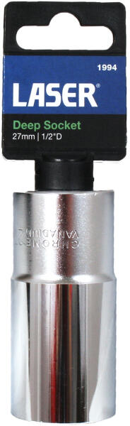 Laser Tools - UK Chrome-Vanádiumból acélból készített 1/2"-os mélyített dugókulcs Műszaki adatok: Meghajtás: 1/2" Dugófej mérete: 27 mm Lap méret: 6 pt (HEX), Anyag: Chrome Vanadium acél Méretek: "A" méret: 27 mm "D1" méret: 35,8 mm "D2" méret: 34 mm "L" méret: 77 mm Teljes hossz: 77 mm Mélycsatlakozó tartomány: 10 mm-32 mm.