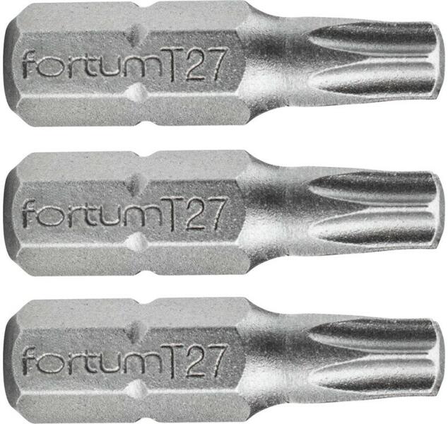 FORTUMbehajtóhegy TORX, 3 db, S2 acél; T 30×25mm, bliszteren A hegy magja S2 osztályú acélból készül 61-62 HRC értékű keménység érhető el, a 13,2-14,7 Nm tartományba eső egészen kiváló szilárdság egyidejű megtartása mellett.