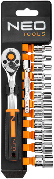 A NEO 1/4"-os dugókulcs készlet 14 db kiváló minőségű króm-vanádium acélból készült elemből áll. A készlethez tartós, precízen működő 90 fogas kilincsművel ellátott racsnis hajtókar is tartozik. A készlet részét képezi a dugókulcsok gazdag sorozata is (4-13 mm közötti méretekben). Ezt egészíti ki egy praktikus 75 mm hosszú hosszabbító. A szerszámok praktikus a