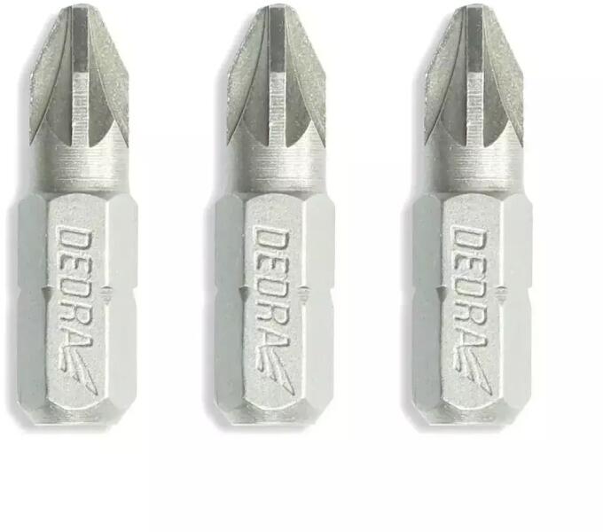 A képen látható méretek példák. A tényleges méreteket lásd a termékleírásban. PZ1/PZ2/PZ3 csavarhúzó bit készlet. A bitek S2 acélból készülnek, amelyet nagy keménység és sérülésállóság jellemez. A kémiai összetételnek és a hőkezelésnek köszönhetően a bitek hosszú ideig megőrzik nagy szilárdsági tulajdonságaikat. A bitek nagy keménységgel és ütésálló