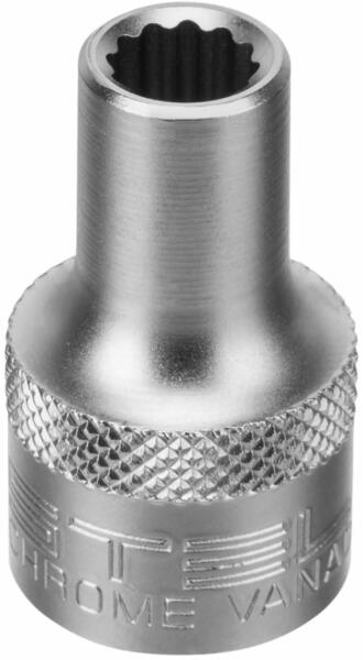 12 szögű kivitel, amely nagyobb nyomatékot eredményez. Krómozott, polírozott, króm-vanádium acél. Belül letört élekkel a csavarfejekre való gyors ráfogás érdekében. Belső négyszög minden oldala horonnyal. Méret: 5/8" Teljes hossz: 27 mm Súly: 50 g