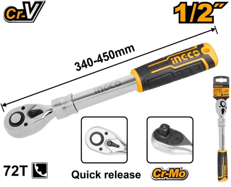 Teleszkópos markolat a szűk vagy nehezen hozzáférhető helyekre való bejutáshoz és a nagyobb eléréshez. Hőkezelt és krómozott a tartósság érdekében. Alkalmas számos feladathoz, többek között autójavításhoz, gépészeti munkákhoz, vízvezeték-szereléshez stb. . Garantált minőség és nagy teherbírású teljesítmény Befogás: 1/2" négyszög Teleszkópos: 340 - 450 mm