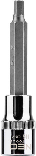 NEO 1/2"-os Imbusz bit dugókulcs, 100 mm hosszú, a DIN 7422 szabványnak megfelelő. A dugóadapter nagy ellenállóképességű króm-vanádium acélból készül. A hatlapú bit kiváló minőségű S2 acélötvözetből készül. A szerszám minőségét bizonyítja a TÜV tanúsítvány és a gyártó által nyújtott 25 éves jótállás. A NEO márka a professzionális igényeket is kielé