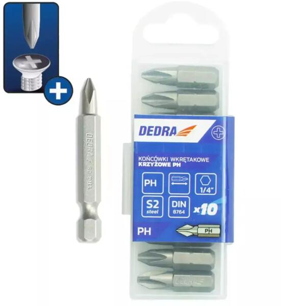 A képen látható méretek példaként szolgálnak. A tényleges méreteket lásd a termékleírásban. Csavarhúzóhegyek PH2. A bitek S2 acélból készülnek, amelyet nagy keménység és ütésállóság jellemez. A kémiai összetételnek és a hőkezelésnek köszönhetően a bitek hosszú ideig megőrzik nagy szilárdsági tulajdonságaikat. A bitek S2 acélból készülnek. Műszaki adato