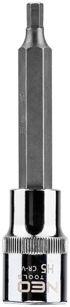 NEO 1/2"-os Imbusz bit dugókulcs, 100 mm hosszú, a DIN 7422 szabványnak megfelelő. A dugóadapter nagy ellenállóképességű króm-vanádium acélból készül. A hatlapú bit kiváló minőségű S2 acélötvözetből készül. A szerszám minőségét bizonyítja a TÜV tanúsítvány és a gyártó által nyújtott 25 éves jótállás. A NEO márka a professzionális igényeket is kielé