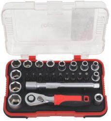 tartalma: 10 db 25 mm-es bit, alapanyag: S2; 12 db 4 – 13 mm-es fej, alapanyag: CrV; 1 db bittartó; 1 db dugófejtartó, 1 db 1/4-os 72-fogas racsnis hajtókar
