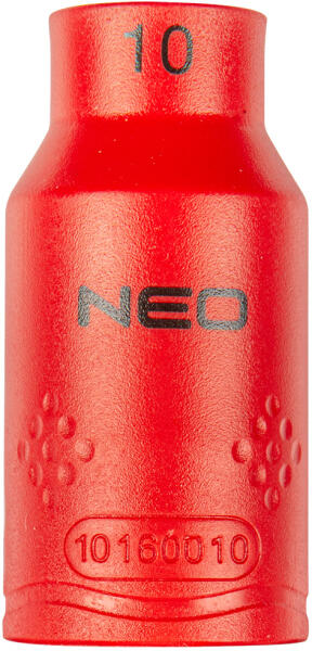 NEO dugókulcs 1/2" 6-lapú (ref. szám 01-181), mérete 10 mm, szilárd króm-vanádium acélból készül. Alkalmassági tesztje 1000 V feszültségen került elvégzésre. A dugókulcs hatszögletű kialakítása megakadályozza a csavar fejének deformálódását.