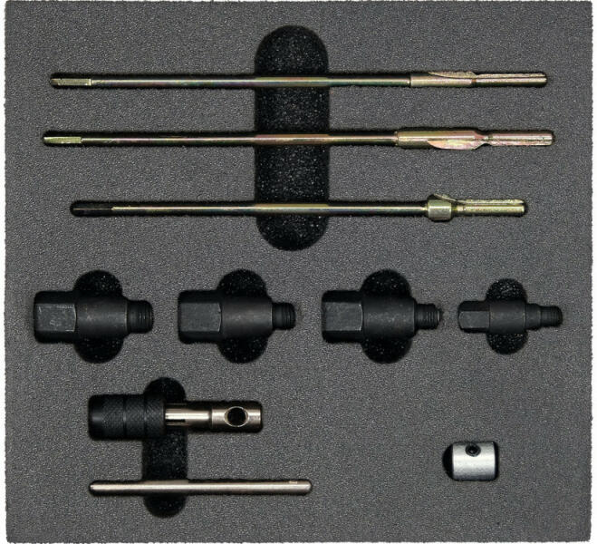 YATO YT-17712 Izzítógyertya tisztító készlet Tisztítókészlet izzítógyertya lyukak és aljzatok tisztításához. A készlet 10 elemet tartalmaz: dörzsárvezető 4 db (M8x1 mm, M10x1 mm, M10x1,25 mm, M12x1,25 mm) dörzsár 3 db (M5-M7, M6-M8, M7-M10) gomb tűvel állj meg