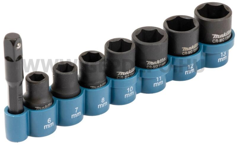 Makita gépi dugókulcs készlet 8 részes 1/4 CR-MO, bit adapterrel Készlet tartalma: 1 db 1/4 x 50mm bit adapter 1 db 6 x 23 mm 1 db 7 x 23 mm 1 db 8 x 23 mm 1 db 10 x 23 mm 1 db 11 x 23 mm 1 db 12 x 23 mm 1 db 13 x 23 mm