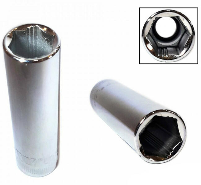 Lok-Typ dugókulcs fej, 3/8"-os, 6 lap fejű kiszerelésben, erős Chrome-Vanádium acélból készült, skót ipari minőségű. Lok-Typ típus, a legfeljebb 85%-ban elhasználódott "elnyalt" csavarok eltávolíthatók ezzel a rendszerrel. Előnye, hogy a szabványos hatlapú csavaroknál is használhatjuk, de kialakításuknak köszönhetően (3 lapján 2 - 2 bevágás található) az elhaszná