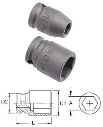 King Tony Méretek: - Külső átmérő elől: 47 mm (D1) - Külső átmérő hátul: 33 mm (D2) - Belső hossz: 24 mm (l) - Teljes külső hossz: 46 mm (L)