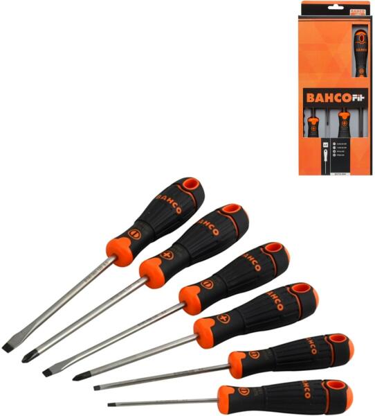 BAHCO - Made in Sweden Ergonomikus, erős, edzett acél, a fej végek szilicum acélba mártva az erősség megtartása érdekében. 3 db lapos és 3 db kereszt (PH) csavarhúzóval. Tulajdonságok: - Chrom-Vanádium, fej végek szilicum acélba mártva. - Markolat puha, ergonomikus, barázdás - Markolaton feltüntetett Gyártó, méret, fejvég kialakítása - Szárban bene szerepel a termék me