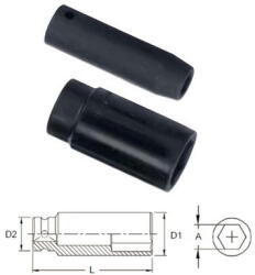 Anyag: Chrome Vanadium acél Felület: feketített Csatlakozás: 1/2" A: 27 mm D1: 38 mm D2: 35 mm Hossz: 78 mm Súly: 340 g