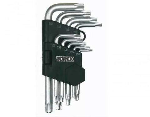 A TOPEX rövid Torx kulcsok nagy ellenállóképességű, a terméknek hosszú élettartamot biztosító króm-vanádium acélból készülnek. A praktikus, mindegyik kulcsnak külön megjelölt rekesszel rendelkező műanyag tok megkönnyíti a tárolásukat. A TOPEX márka ezermestereknek készül. Torx kulcs készlet 9 db?os, T10-T50, hosszú, CrV acél, méretek: T10, T15, T20, T25, T27, T30,