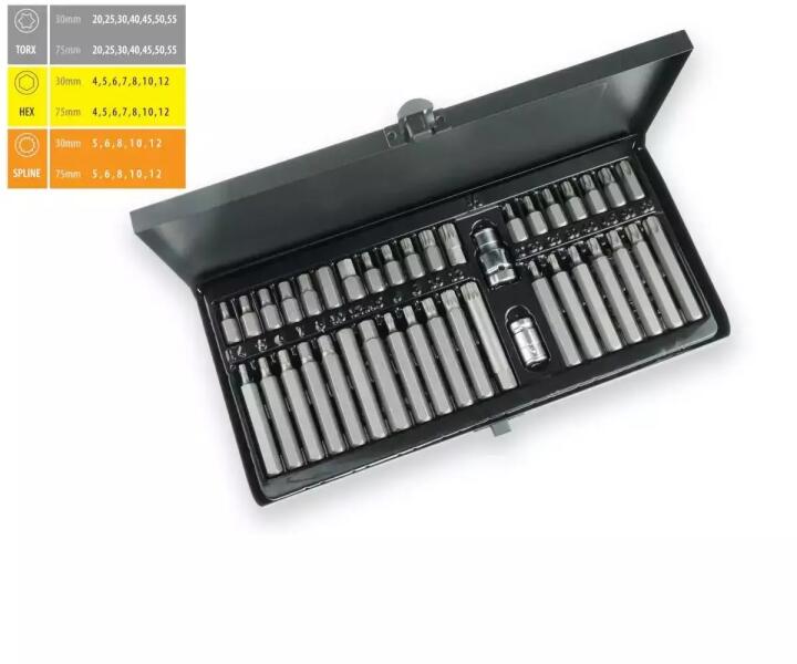 40 csavarhúzóhegyből álló készlet. A készlet 30 és 75 mm hosszúságú TORX, HEX és SPLINE biteket tartalmaz. A bitek nagy szilárdságú króm-vanádium acélból készültek, ami garantálja tartósságukat és korrózióállóságukat. A teljes készletet egy praktikus fémtáskában szállítjuk. A teljes készletet praktikus fémtáskában szállítjuk. Specifikációk: Tip típus:SP