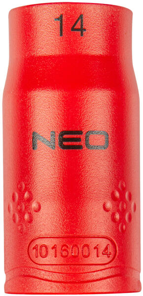 NEO dugókulcs 1/2" 6-lapú (ref. szám 01-185), mérete 14 mm, szilárd króm-vanádium acélból készül. Alkalmassági tesztje 1000 V feszültségen került elvégzésre. A dugókulcs hatszögletű kialakítása megakadályozza a csavar fejének deformálódását.