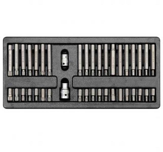 Szerszámoskocsi fiók 40 db bitfej Műanyag fiók bitfejeknek ADAPTER 1/2"&3/8"; HEX bitfejek 30 mm (H4, 5, 6, 7, 8, 10, 12) & 75 mm (H4, 5, 6, 7, 8, 10, 12) / TORX bitfejek 30 mm (T20, T25, T30 , T40, T45, T50, T55) & 75 mm (T20, T25, T30, T40, T45, T50, T55) / SPLINE Bitfejek, 30 mm (M5, 6, 8, 10, 12) & 75 mm (M5, 6 , 8, 10, 12) AISI S2 EAN:5906083955389