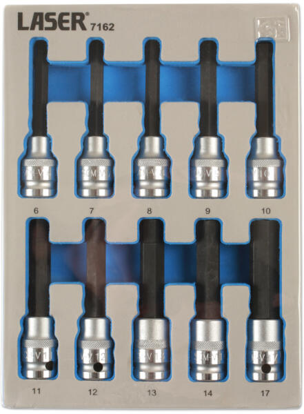 Laser Tools - UK Metrikus HEX rátűzőkulcs készlet 10 részes kiszerelésben Tulajdonságok: Meghajtás: 1/2" - Méretek: 6, 7, 8, 9 , 10, 11, 12, 13, 14, 17 mm - Hosszúság: 100 mm - S2-es edzett acélból készűlt Chrome-Vanádium anyagú dugófejekkel - EVA polifoam habszivacs anyagú tárolóban EVA Habszivacs anyagú puha tárolóban szállítva Méret: 252x186x43 mm Súly: 1,46 kg