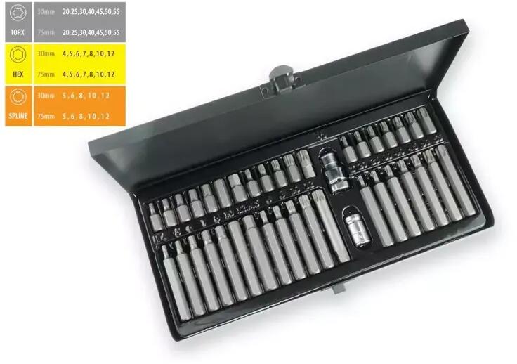 40 darabos csavarhúzóhegy készlet. A készlet TORX, HEX és SPLINE biteket tartalmaz 30 és 75 mm hosszúságban. A bitek nagy szilárdságú króm-vanádium acélból készülnek, ami garantálja tartósságukat és korrózióállóságukat. A teljes készletet egy praktikus fémdobozban szállítjuk. A készletet egy praktikus fémdobozban szálítjuk. Technikai adatok: Tip típus: SPLINE 5 ,