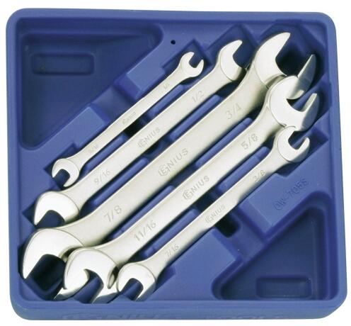 Genius Tools - Canada 5 db-os colos méretezésű készlet kék műanyag tartórekeszben: Méretek: 1/4"x5/16", 3/8"x7/16", 1/2"x9/16", 5/8"x11/16", 3/4"x7/8" Két vége ükrösre polírozott, középen mattított exluzív, vékonyított kivitel. Fiókosztás: 1:6