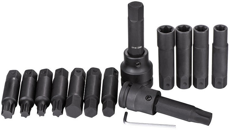 LEÍRÁS Anyaga: króm-molibdén-acél. A készlet tartalma: 5db torx bit: T60, T70, T80, T90, T100 hossz: 107mm 4db imbusz bit: 17mm, 19mm, 22mm, 24mm hossz:107mm 4db E-torx bit: E18, E20, E22, E24 hossz:107mm 1db befogó adapter: 3/4 1db befogó adapter: 1″ 1db 4mm imbusz kulcs