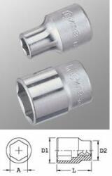 3/8" - os meghajtó, metrikus, normál hossz, 6-szögű, DIN 3129 szerint gyártva. Kiváló minőségű króm-molibdén acél. Feketeoxidált felület, lézerrel gravírozott feliratok. Méret: 9 mm Alak: A Méretek: D2 = 19 mm, D1 = 15 mm, L2 = 8 mm, L = 30 mm Súly: 40 g