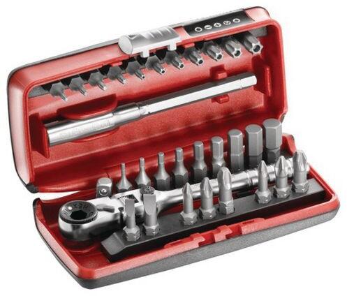 Kompakt, rugalmas racsnis bitkészlet. 28 különböző bit. Kiterjesztés 100 mm.