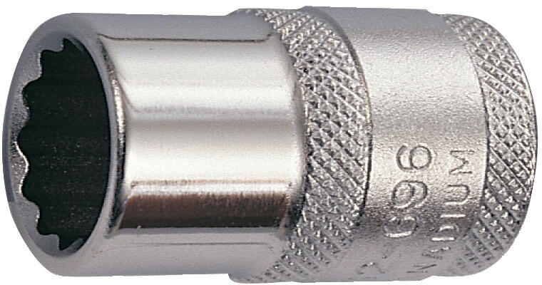 12 szögű kivitel, amely nagyobb nyomatékot eredményez. Krómozott, polírozott, króm-vanádium acél. Belül letört élekkel a csavarfejekre való gyors ráfogás érdekében. Belső négyszög minden oldala horonnyal. Méret: 1/4" Teljes hossz: 27 mm Súly: 30 g