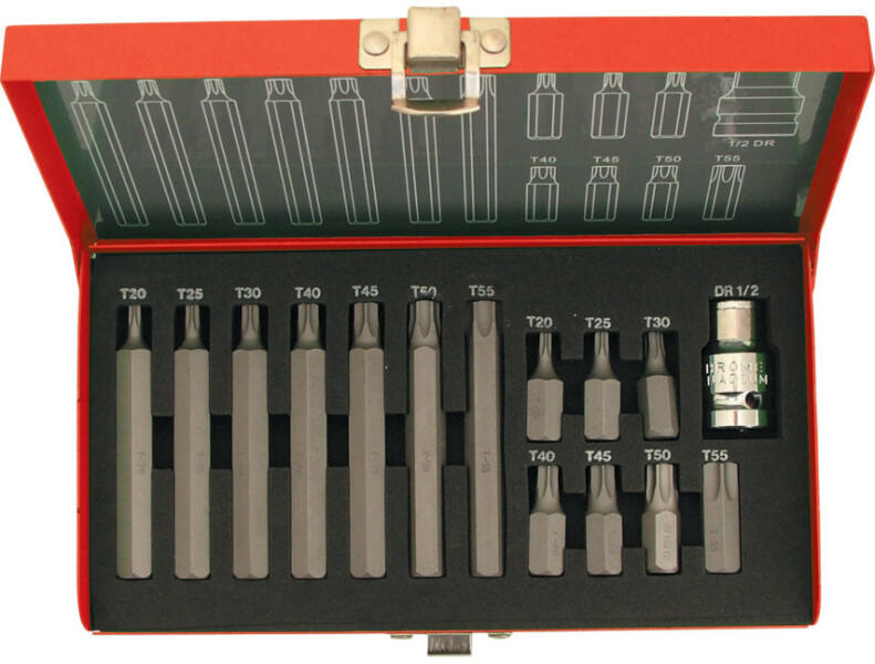 1/2" négyszögcsatlakozó x 10 mm-es hatszögű szár tokkal TORX 10 x 75 mm: T20, T25, T30, T40, T45, T50 és T55 TORX 10 x 30 mm: T20, T25, T30, T40, T45, T50 és T55 A Torx a Camcar/Textron Inc. által bejegyzett márkanév.