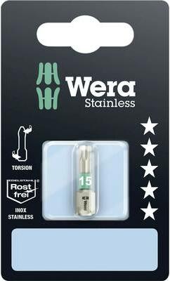 3867/1 TS nemesacél bit, TORX T15 x 25 Nemesacél bitek torziós zónával, különösen alkalmas nemesacél csavarok csavarozásához. A nemesacél bitek meggátolják az idegen rozsda veszélyét, ami hagyományos acél bitek használatakor fennáll. A torziós zóna elnyeli a felesleges forgatónyomatékot, és növeli a bitek élettartamát. Jellemzők: A Wera bitek 100%-ban nemesacélból k