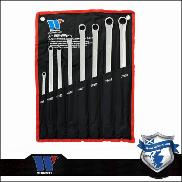 Welzh Werkzeug - Scotland Fényesre polírozott extra hosszú egyenes csillag-csillag kulcs készlet. A hosszúságának köszönhetően nagyobb nyomatékot fejthetünk ki vele. Tulajdonságok: - Extra-hosszú egyenes csillag-csillag kialakítású - 0 fokos eltolás Méret: 8x9 mm, 10x12 mm, 11x13 mm, 14x15 mm, 16x17 mm, 18x19 mm, 21x23 mm, 22x24 mm