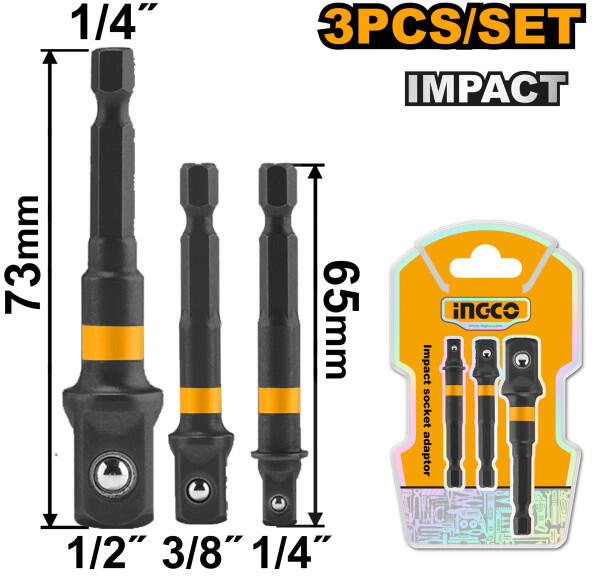 Anyaga: CrVMéretek: 1/4", 3/8", 1/2"Hossz: 65 mm (1/4", 3/8"), 73 mm (1/2") Szállítási terjedelem: 3 db dugókulcs adapter, Bliszterben