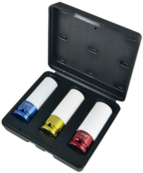 Leírás 3 darabos 1/2"-os dugókulcs készlet alumínium tárcsákhoz Műanyag borítással a felni védelme érdekében Speciális kerék eltávolítás 1/2" négyzet alakú meghajtó Méret: 17-19-21mm Hossza 85 mm