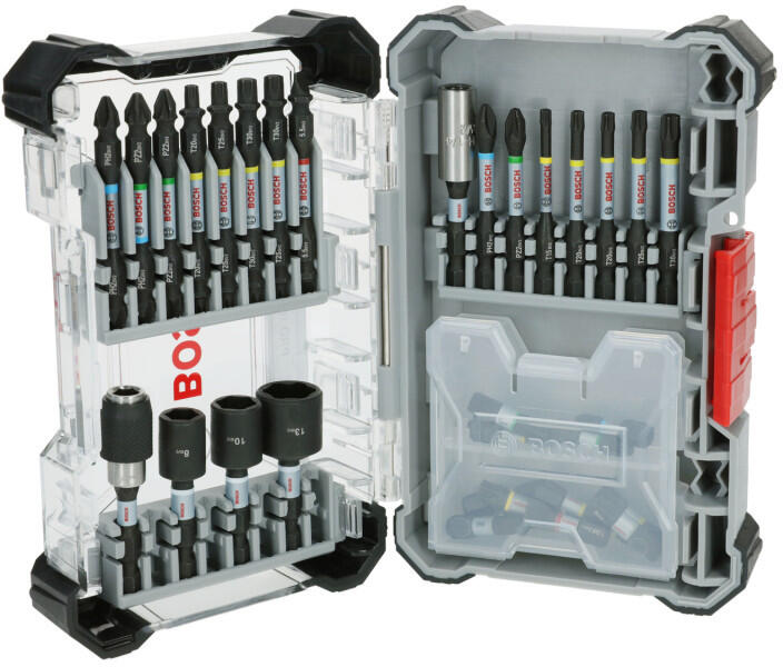 A készlet tartalma: 25 mm-es csavarbit: PH1; PH2 PZ2; PZ3 T10; T15; T20 (2 db); T25 (2 db); T30; T40 H5; H6 SL6,5 55 mm-es csavarbit: PH2; PZ2 T15; T20 (2 db); T25; T30 65 mm-es csavarbit: PH2/PH2; PH2/PZ2; PZ2/PZ2 T20/T20; T25/T25; T30/T30; T25/T30 SL1x5,5/SL1x5,5 50 mm-es dugókulcs: 8; 10; 13 mm 60 mm-es bittartóQuick Change bittartóPick and Click doboz