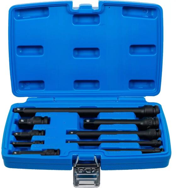 Kompakt készletösszeállítás különböző és be- és kihajtófejekkel Alkalmas kézi ütvecsavarozó csavarkulcsok használatára Rögzítőcsapos és gumigyűrűs befogóval Biztonságos és rendezett tárolás műanyag tárolótáskában Meghajtott profil: Négyszög Anyag: Króm - molibdén acél Felület: Barnított, fekete Bruttó súly: 1624 g Készlet tartalma 1 hosszabbító légkulc