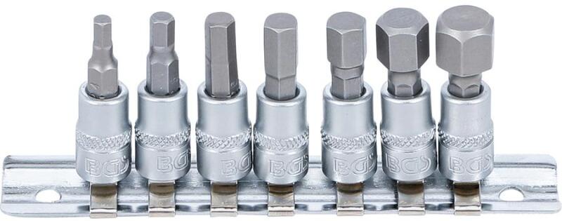 Recézéssel Anyag: Króm - vanádium acél Felület: Krómozott, matt Fémsínen Bruttó súly: 172 g Készlet tartalma 7 db Bitfej, 6,3 mm (1/4"): 4 - 5 - 6 - 7 - 8 - 10 - 12 mm