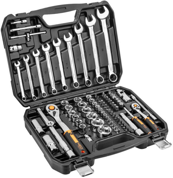 A NEO ¼"-os és ½"-os dugókulcs készlet (kat. sz. 10-059) 82 db kiváló minőségű króm-vanádium acélból készült elemből áll. A készlet részét képezi egy ¼"-os és egy ½"-os racsnis hajtókar is (hosszú élettartamú, 90 fogas kilincsművel), hajlított ergonómikus markolattal. A készlet beütött feliratos, hatlapú dugókulcsok (4-32 mm közötti méretekben) és csavarhú
