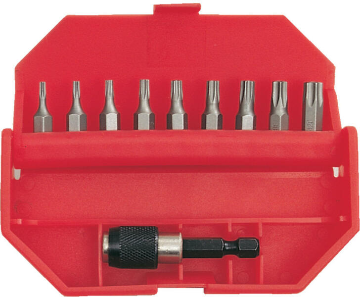 T8, 9, 10, 15, 20, 25, 27, 30 és 40. 25 mm hosszú, 1/4" hatszög bitek, hornyolt, 1/4" hatszög szárú gyorscsatlakozós közbetéttel.