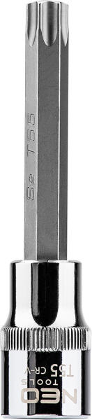 NEO 1/2"-os Torx bit dugókulcs, 100 mm hosszú. A dugóadapter nagy ellenállóképességű króm-vanádium acélból , a Torx bit pedig S2-es acélból készül. A hatlapú bit kiváló minőségű S2 acélötvözetből készül. A szerszám minőségét bizonyítja a TÜV tanúsítvány és a gyártó által nyújtott 25 éves jótállás. A NEO márka a professzionális igényeket is kielégí