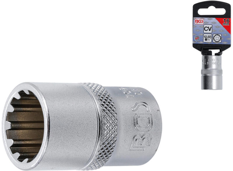 BGS Technic - Germany Gear Lock Alldrive profilú dugókulcs Tulajdonságok: - Anyaga: Chrome-Vanádium acél - Meghajtás: 1/2" - Profil méret: 16 mm (normál, rövid kivitel) - Krómozott felületképzés, recézett csíkszéllel - Falra akasztható műanyag füllel a könnyebb tárolásért. Súly: 70 g